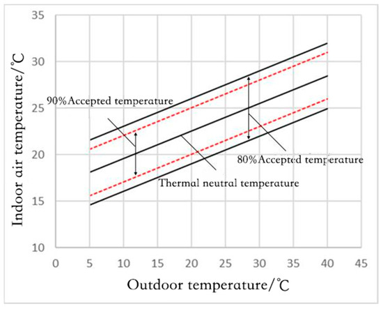 According to the studies of De Dear [33] and Nicol [34], 90% of respondents can accept a maximum temperature difference of 2.5 °C on the basis of neutral temperature, while 80% of respondents can accept a maximum temperature difference of 3.5 °C on the basis of neutral temperature. Figure 12 shows the indoor thermal comfort zones corresponding to different outdoor temperatures of rural houses in the Xuzhou area.