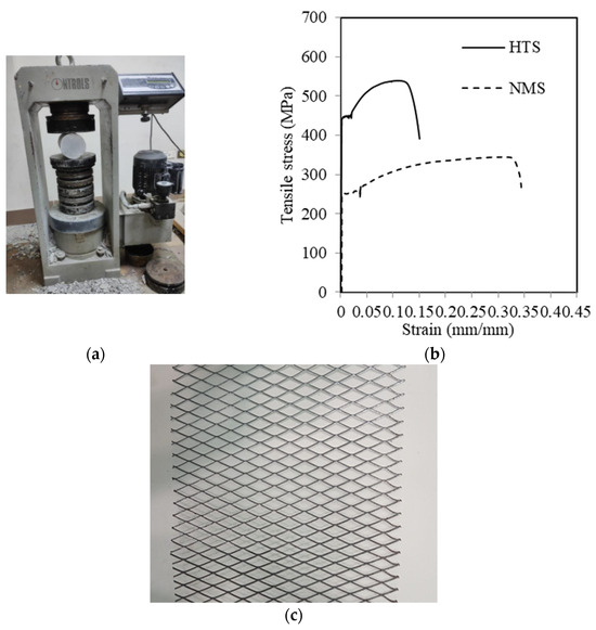 The inside of the SHCC layers was strengthened by the introduction of steel mesh fabric (SMF). Tensile tests were performed to determine the mechanical properties of the SMF, revealing a proof stress of 285 MPa, a maximum strength of 360 MPa, and a Young’s modulus of 190 GMPa. The SMF reinforcement was made of expanded metal mesh. SM made use of a local commodity. Figure 1c shows the SMF. It is not comparable; instead, the opening has the shape of a diamond. The opening side measures 42 mm in length. The cross-section of the strand is 3.2 × 2.1 mm, and the aperture’s greatest and smallest diameters are 70 mm and 28 mm, accordingly. The quantity of the SMF was 2.7 kg/m2.