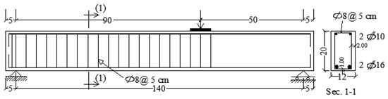 Eight RC beams were prepared and tested. The testing beams were developed with net spans spanning 140 cm, along with cross-sectional measurements of 12 cm in breadth and 20 cm in thickness. The beams had an effective depth of 17.4 cm, with a clear concrete cover of 1.0 cm beneath the bottom tension longitudinal rebars. Two HTS 16 mm diameter rods were positioned at the bottom of the beam for tension strength as part of the longitudinal reinforcement that was included in the design according to Egyptian code [36]. In addition, two HTS bars with a 10 mm diameter were used to strengthen the compression zone at the top of the beams. To create shear stress inside the beams, a three-point loading system was used in the setup for the experiment. A deliberate adjustment in the load’s midpoint produced a 50 cm shear span on a single side, translating into an about 2.87 shear span-to-effective depth ratio. NMS 8 mm diameter stirrups were uniformly positioned at 5 cm spacing along one of the shear spans, as shown on the left side in Figure 2, to further investigate the shear capacity of the bea-ms. This increased the shear resistance in this section. In contrast, the opposing shear span was purposefully left unreinforced with stirrups, resulting in a controlled environment that will mostly cause shear failure on this side. This asymmetrical reinforcement approach was adopted to ensure that shear pressures would be the main collapse mode, thereby reducing the possibility of flexural collapse.