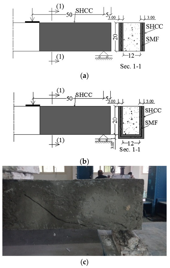 After application of Equation (3), the predicted ultimate shear (VSHCC) of each strengthened beam was 16.16 kN. VSMF provided by the SMF inside the SHCC layers was calculated using the following equation:
