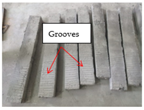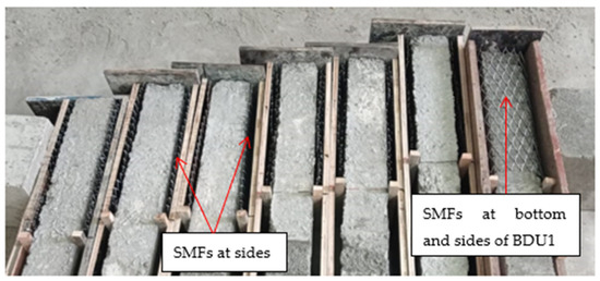 The following steps were implemented to strengthen the tested beams: (1) all strengthened beams were grooved at the sides and soffit to enhance the bond between the concrete surface and SHCC layers. (2) The grooved section was 4 × 4 mm and extended along the whole height of the beam. (3) The spacing of the grooves was 30 mm and it spread along the shear span or strengthening region (Figure 4). (4) These grooves were slotted using a concrete cutter and then they were cleaned using an air compressor. (5) After that, they were cleaned with water to remove any dust. (6) The wood forms were prepared around the beams to cast the SHCC mixture. (7) Before casting the SHCC, the internal reinforcements (SMFs) were placed inside the forms (Figure 5).