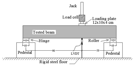 A comprehensive illustration of the experimental configuration and the particular measurements used for the test beams can be seen in Figure 6. With one support acting as a hinge and the other serving as a roller, a support structure was created to replicate real-world circumstances. With a 200 kN capacity machine, the pressure applied to the beams was precisely regulated, ensuring accurate load application and measurement. A displacement transformer was positioned below the load in order to precisely track the vertical deflection that the beam experienced at the time of load application. Also, the cracks were observed and marked.