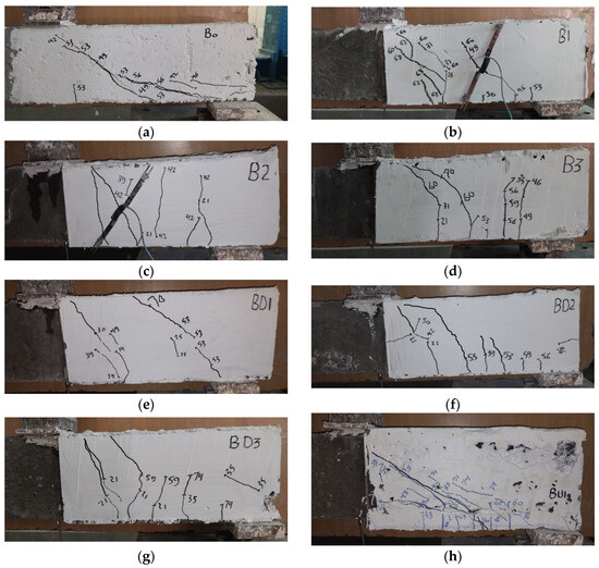 Failures of tested beams. (a) Control B0, (b) B1, (c) B2, (d) B3, (e) BD1, (f) BD2, (g) BD3, (h) BDU1.