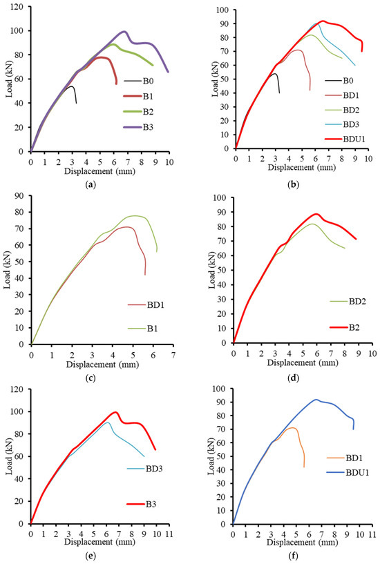The applied load versus the displacement under the loading point. (a) Group A, (b) Group B, (c) Group C, (d) Group D, (e) Group E, (f) Group F.