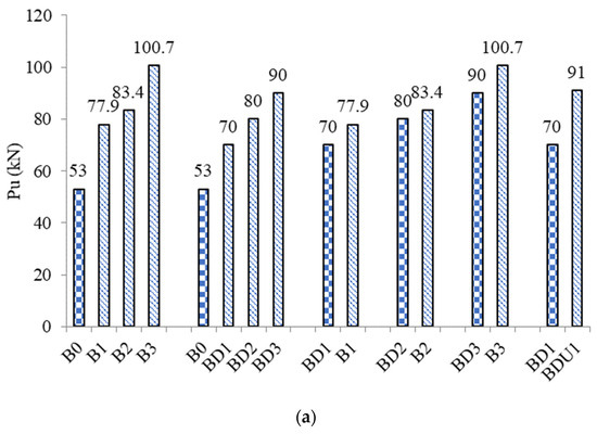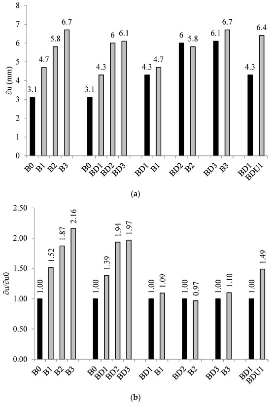 The ∂u of the damaged beams (BD1, BD2, and BD3) in groups C, D, and E were com-pared with those of their counterparts that were not damaged (B1, B2, and B3). In comparison to the damaged beams BD1, BD2, and BD3, the ∂u of the intact beams B1, B2, and B3 was marginally higher. A single layer of SMF inside the SHCC provided the ∂u of beam B1, which was 9% more than the ∂u of beam BD1, which was also produced by a single layer of SMF within the SHCC. The ∂u of beams B2 and B3 was around 7% higher than that of the damaged beams BD2 and BD3. The reason is that the contribution of the original concrete to the damaged beams was reduced due to the crack that occurred in them before strengthening. Therefore, the strengthening layers are responsible for bearing the shear force.