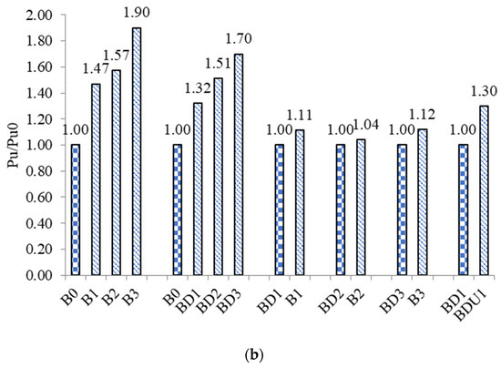 Effect of internal reinforcement inside SHCC layers on the shear strength of the strengthened beams. (a) Values of the ultimate load (Pu). (b) The ratio of the ultimate load of each beam (Pu) to the ultimate load of the control beam.