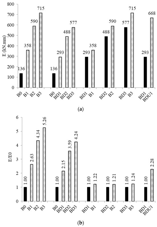 Effects on the energy absorbed by the strengthened beams. (a) Values of the energy absorbed (E). (b) The E-to-E0 ratio of the control sample to the strengthened sample.