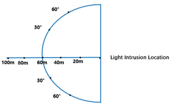 The instruments utilized in the field test comprised the CA-2500 2D color luminance meter (Konica Minolta, Tokyo, Japan), the CL-500A illuminance meter (Konica Minolta, Tokyo, Japan), and a laser range finder (Delixi, Yueqing City, China), with detailed specifications provided in Table 2. The data gathered encompassed vertical illuminance, color temperature, dominant wavelength, and spectral illuminance within a residential area. Additionally, parameters such as road dimensions, the area of the LED advertisement screen, the distance from the light source to the measurement point, as well as the brightness and color characteristics of the LED display were documented. For data that could not be directly measured within the community, adjustments were implemented by modifying the measurement distance and angle. The CA-S20W software facilitated the analysis of the spatial distribution of luminance, color temperature, and chromaticity of LED displays at various angles and distances. A five-point sampling test method was employed, as illustrated in Figure 2. In establishing the deployment program, considerations were made regarding the distance between the monitoring point and the LED screen, as well as the angle of observation. The monitoring points were strategically positioned in as many locations as feasible; where site conditions permitted, points were deployed up to 100 m away, as the influence of illumination beyond this distance is minimal. It was ensured that deployment points were adequately distributed at angles of −30°, −60°, 0°, 30°, and 60° along the same half-circle arc. During the collection of LED illumination data, the distance was maintained within a semicircle of equal distance, with the 2D color luminance meter positioned at a height of 1.5 m. Measurements were taken at angles of −30°, −60°, 0°, 30°, and 60°, where 0° corresponds to the position of the illuminance meter directly facing the LED screen. Given that the illumination and brightness of the LED screen fluctuate randomly with color variations, multiple sets of data were recorded to ensure a comprehensive analysis, ultimately yielding maximum, average, and minimum values.
