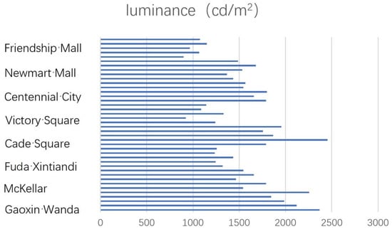 The measurement data presented in Figure 3 indicate that the advertising screen exhibits a significantly high brightness level, reaching a maximum of 2456 cd/m2. During the testing process, it was observed that the brightness of the screen fluctuated rapidly, transitioning abruptly between dark and light states. Such variations have the potential to adversely impact the well-being of nearby residents, particularly regarding their sleep quality. The findings of this assessment revealed that the brightness levels consistently exceeded the established standards.