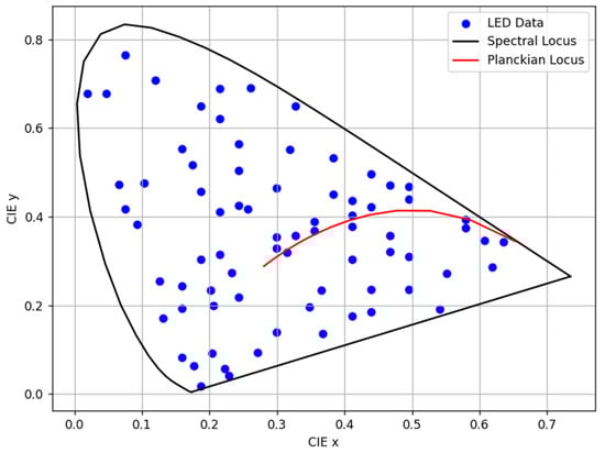 Since the color of the LED advertising screen changes rapidly, we randomly measured and recorded the luminance and chromaticity coordinates of each color change. The color coordinates of the intruding light of the LED advertising screen obtained from the on-site test are plotted as shown in Figure 4. Due to the image noise during the on-site shooting, abnormal data have been excluded from Figure 4.
