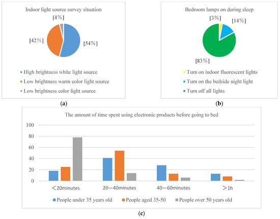 Indoor light source, lamps, and lanterns open. The use of electronic products time survey. (a) Indoor light source survey situation. (b) Bedroom lamps on during sleep. (c) The amount of time spent using electronic products before going to bed.