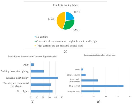 Survey of residents’ shading habits, sources of light intrusion, and types of indoor activities affected. (a) Residents’ shading habits; (b) statistics on the sources of outdoor light intrusion; (c) light intrusion affects indoor activity types.