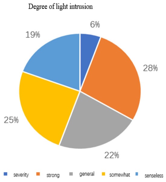 As illustrated in Figure 6, the findings from the survey regarding residents’ shading practices indicate that a considerable number of individuals utilize curtains to mitigate the influx of external light, perceiving them as an effective solution for this purpose. Nevertheless, 23% of respondents refrain from employing curtains to obstruct light, primarily due to concerns regarding potential interference with indoor ventilation. Additionally, 32% of residents reported using traditional curtains, expressing the belief that these do not entirely prevent external light penetration. The survey results concerning the sources of outdoor light disturbance reveal that over half of the participants feel they are subjected to light nuisance. The predominant sources identified for this outdoor light intrusion include commercial signage, dynamic LED displays, and street lighting. Regarding the types of indoor activities adversely affected by light intrusion, respondents indicated that such disturbances are particularly likely to disrupt sleep and rest.
