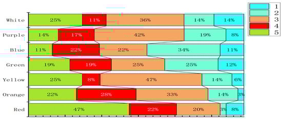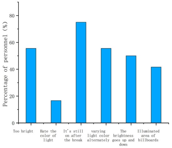 For intrusive LED advertising screens, subjective feeling survey results show that more than half of the respondents think that light is intrusive on their lives to varying degrees (Figure 7); 75% of the respondents think that the billboard is still very bright after their rest, affecting sleep, while half of the respondents chose the brightness of the billboard, the color of the light, the light-emitting area as a factor that affects sleep (Figure 8). In addition, as shown in Figure 9, the results of the survey on the annoyance of light sources showed that the most annoying colors for everyone were red, yellow, and white light sources.