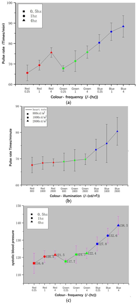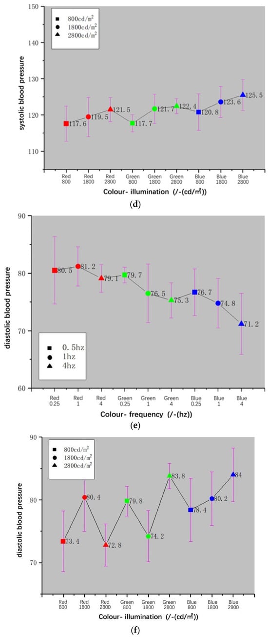 The systolic pressure in the red-light group is significantly lower than that in the blue-light group, as shown in Figure 13c–f. However, the diastolic pressure is significantly higher in the red-light group than in the blue-light group, indicating that short wavelengths of light cause an increase in pulse pressure. There was a negative correlation between diastolic blood pressure and frequency, and a positive correlation between systolic blood pressure and frequency. Nevertheless, there was no discernible change in either luminance value. From the analysis of covariance: F color = 0.418, p = 0.659; F frequency = 1.317, p = 0.271; F brightness = 1.182, p = 0.309 (systolic blood pressure); F color = 0.768, p = 0.466; F stroboscopic = 1.245, p = 0.291; F luminance = 0.969, p = 0.381 (diastolic blood pressure); therefore, for the experiment there was no significant effect of the difference between systolic and diastolic blood pressure and color, strobe, and luminance between the experiments.