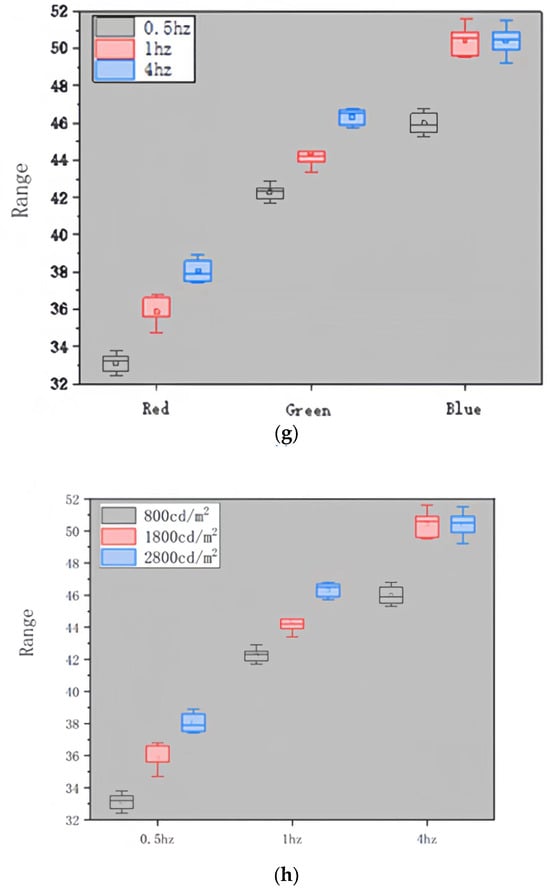 This study aimed to investigate the impact of various lighting environments on the physiological parameters of the human body. To achieve this, the TCM Meridian Sub-health Detector was employed to evaluate the physiological responses by measuring the 24 good conductance current values of participants. The box plots presented in Figure 13g,h illustrates the variations in good conductance current values among subjects. The findings indicate that exposure to green and blue intrusive light results in higher good conductance values compared to red intrusive light. This suggests that short-wavelength intrusive light enhances the autonomic excitability of the human body. Furthermore, in the same color of interfering light, an increase in frequency resulted in a gradual increase in human BLC (body conductance level) values, suggesting that faster interfering light strobes amplify human excitability. Similarly, under consistent strobe conditions, an increase in brightness also leads to a gradual increase in the BLC value, suggesting that higher brightness levels enhance human excitability. The average results across the nine experimental conditions were analyzed using the extreme difference method, as summarized in Table 8. The findings reveal that the order of influence on good conductance values is as follows: strobe > color > brightness. Covariance analysis yielded an initial F value of 1587.703 (p = 0.000), F for color at 5.410 (p = 0.006 < 0.01), F for frequency at 8.386 (p = 0.000 < 0.01), and F for brightness at 2.359 (p = 0.096). Consequently, after accounting for the significant difference in the initial value, it is evident that both color and frequency exert a significant influence over good conductance values, while brightness has an effect that is not statistically significant.