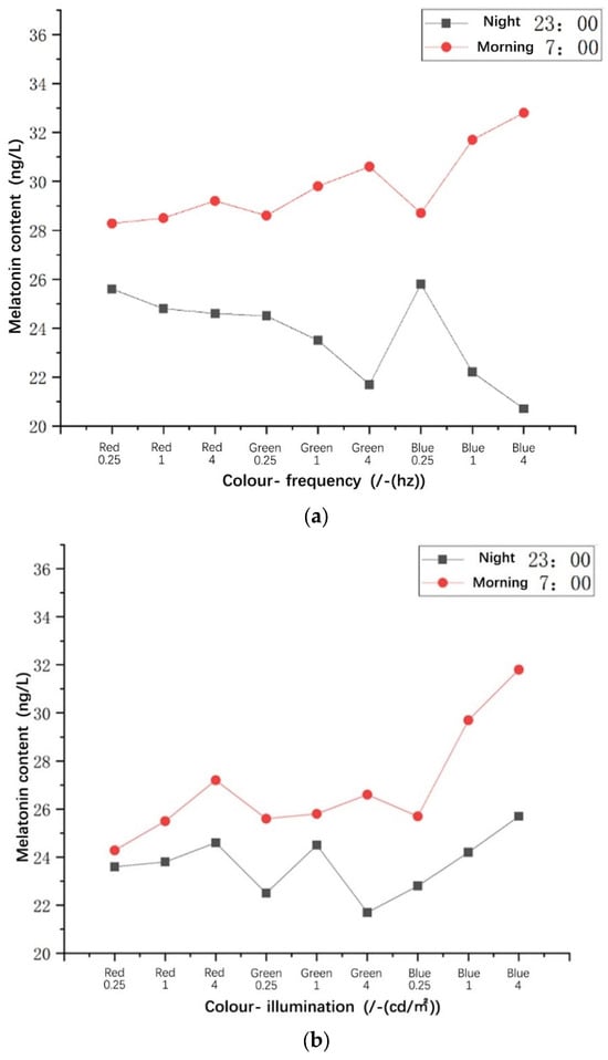 Experiment 1 plot of changes in melatonin content. (a) Changes in melatonin content in the morning and evening under different colors and strobes. (b) Changes in melatonin content in the morning and evening under different colors and brightness.