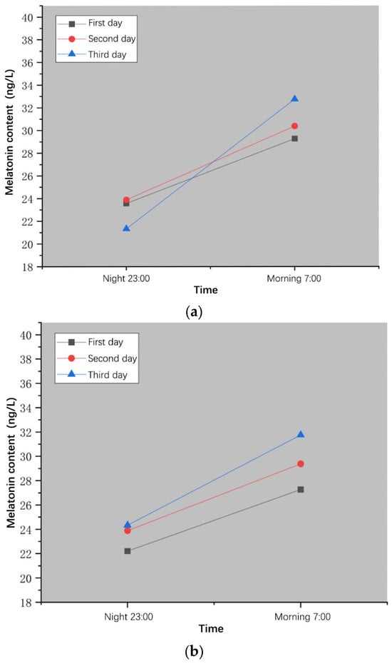 Figure 15 shows a graph of the changes in melatonin content in the morning and evening of the subjects in the second experiment. Comparison of the salivary melatonin content at 23:00 on the first day under pure dark conditions and at 7:00 a.m. on the second day revealed that the melatonin content of the saliva samples collected at 11:00 p.m. on the second day in the evening, when unaffected by the light source, was roughly the same as that on the previous day, but after a night of dark-light exposure, the salivary melatonin content in the morning increased significantly. Furthermore, the salivary melatonin content at 11:00 p.m. on the third day decreased significantly, indicating that sustained night light inhibits human melatonin secretion, resulting in an affected circadian rhythm. Salivary melatonin was significantly lower at 23:00 on the third day, suggesting that continuous nighttime light exposure suppresses melatonin secretion in humans, leading to a phase shift in circadian rhythms and an overall backward delay. Also, in the two groups of different illumination levels of 5 lx and 10 lx in the sleep environment, the overall trend of the change was the same, but the values did not show a significant difference. It is evident that light has a profound inhibitory effect on melatonin levels and shortens the body’s internal representation of night duration. Thus, exposing oneself to light for prolonged periods late at night disrupts melatonin signaling and may therefore affect sleep, thermoregulation, blood pressure, and glucose homeostasis.