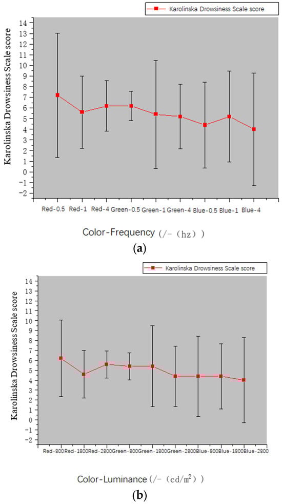 Graph of changes in Karolinska Drowsiness Scale scores. (a) Means and standard errors of Karolinska Sleepiness Scale scores for different colors and frequency flashes (b) Means and Standard Errors of Karolinska Drowsiness Scale Scores in Different Colors and Luminance Levels.