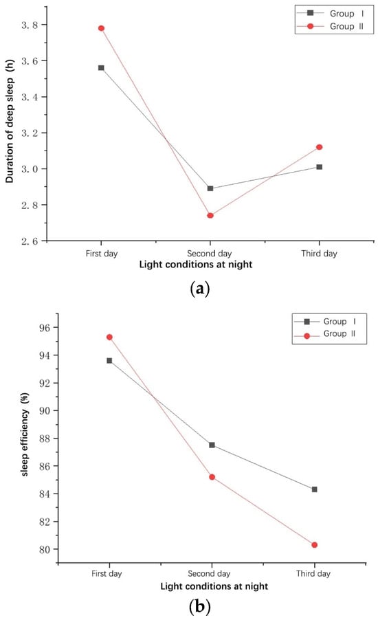 Graph of changes in sleep parameters. (a) Variation in human deep sleep duration in low illumination environment. (b) Change in human sleep efficiency in low illumination environment.