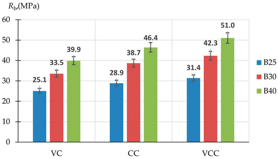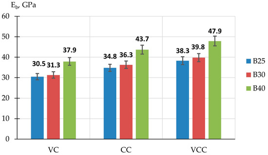 - Concrete of grades B25, B30 and B40, produced using the vibrocentrifugation technology, had the best strength properties. The compressive strength of centrifuged and vibrocentrifuged concrete of grades B25, B30 and B40 is on average 16.3% and 27.2% higher, respectively, than that of vibrated concrete. The axial compressive strength of centrifuged and vibrocentrifuged concrete is, on average, 15.7% and 26.4% higher, respectively, than that of vibrated concrete. The elastic modulus of centrifuged and vibrocentrifuged concrete is, on average, 15.1% and 26.4% higher, respectively, than that of vibrated concrete. Using centrifugal compaction technology ensures the formation of a pronounced heterogeneous structure in concrete samples of annular cross-section, where the outer layer is the densest and strongest because of the high content of coarse aggregate, the middle layer contains less coarse aggregate and a larger portion of cement-sand mortar, the inner layer is mainly represented by cement particles and water squeezed out of the outer layers, and is the least durable. This variatropic structure makes it possible to obtain composites with improved properties. When combining centrifugal compaction and vibration, the coarse aggregate is distributed most evenly between the middle and outer layers, due to which the effectiveness of the strength properties of concrete further increases.