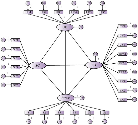 Table 3 demonstrates the number of measures for the different dimensions and their Cronbach’s alpha coefficients for assessing internal consistency. SC had the highest reliability (0.931), indicating that the instrument was very reliable; stress, CY, and EX had good reliabilities (0.819–0.822); and UB and RPA had acceptable reliabilities (0.728–0.789), but were relatively low and may need to be optimized. Overall, the scales have high reliability in measuring employees’ security awareness, stress, burnout, and insecure behavior, and are suitable for use in research and practice.