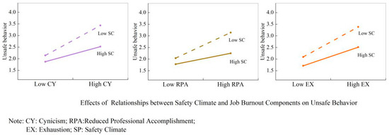 In addition, Figure 4 reveals the slopes of the moderating effect of safety climate on the relationships between the three dimensions of job burnout and unsafe behaviors. Therefore, Hypotheses 7 and 8 are supported.