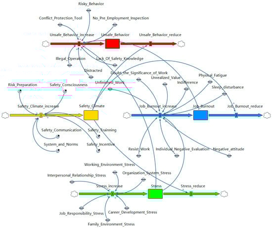 Although the Structural Equation Model (SEM) diagram can well reflect the relationships between various factors influencing employees’ job burnout and unsafe behaviors and the intervention strategies with safety climate as the core, it cannot reflect the internal operating mechanism of the intervention system. Therefore, in order to better explore the deep relationships among intervention systems such as the safety communication intervention system, the safety supervision intervention system, and the safety incentive intervention system, this paper introduces state variables, rate variables, and so on to construct a System Dynamics Model for the job burnout of high-risk miners.