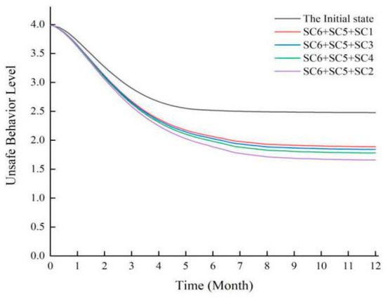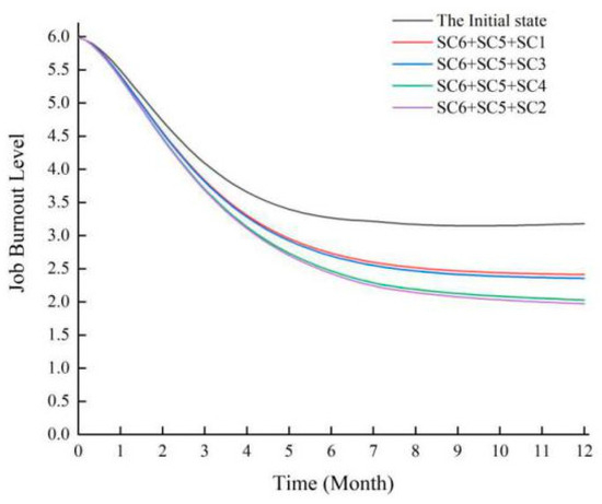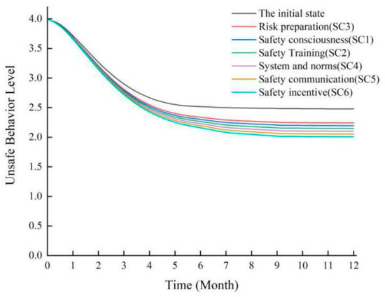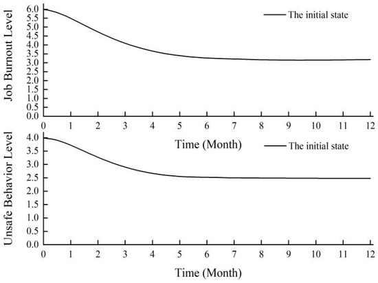 It can be seen from Figure 6 that, from the initial state, in the first month, the downward trend of the job burnout level was relatively stable. From the first month to the fourth month, it changed more rapidly, showing an exponential decline on the whole. From the fourth month to the seventh month, the downward trend gradually slowed down. Finally, the downward trend became stable after the seventh month. The level of unsafe behaviors also changed accordingly. Eventually, the job burnout level remained at around 3.29, and the level of unsafe behaviors remained at around 2.49. This is similar to the mean values of the job burnout level and unsafe behaviors obtained from the questionnaire, indicating that the simulation effect of the model is basically consistent with the actual situation. Based on the above analysis, under the existing safety conditions, the levels of employees’ job burnout and unsafe behaviors decline and finally remain at relatively high levels.