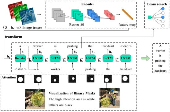 Due to the complexity and strong noise interference of construction sites, using CNN to process images tends to make the network focus on the areas that need attention, so that a limited-length vector can adaptively pay attention to important objects. Therefore, an attention mechanism is added to the decoder. The attention mechanism is a resource allocation scheme that allocates computing resources to more important tasks and solves the problem of information overload when computing capacity is limited []. The attention mechanism is commonly classified into two types: soft attention and hard attention []. Soft attention is a probability-based mechanism that assigns a weight to each input position, indicating its importance to the model’s output. Hard attention, on the other hand, is a sampling-based mechanism that selects a subset of the input data for the model’s output calculation. This paper adopts the soft attention mechanism, as it allows for weighted processing of the input image at each time step, enabling dynamic focusing on different regions of the input image when generating each word, resulting in more accurate performance. In addition, the differentiability of the soft attention mechanism enables it to be directly trained using the backpropagation algorithm, which is superior to the discrete and non-differentiable hard attention mechanism.