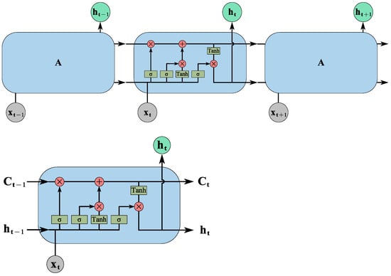 In the model, and are passed through the forget gate, which uses the σ function as shown in Equation (1) to output and decide which information to discard by multiplying it with . Then, and are passed through the input gate, which uses the σ function as shown in Equation (2) to output it, representing the decision of which information to keep for update. Then, a new candidate value (.) is created using the tanh function as shown in Equation (3). The old state, , is updated to Ct using the output of the forget gate and the input gate, as shown in Equation (4). The output gate, which also uses the σ function, is used to output based on and . Then, a new state, , is processed using the function and combined with using new control parameters to generate the final output, as shown in Equation (5). Finally, a new is generated as shown in Equation (6). The LSTM network continuously updates its control parameters and selectively passes and discards information using the memory gate, forget gate, and output gate, generating sequential data.