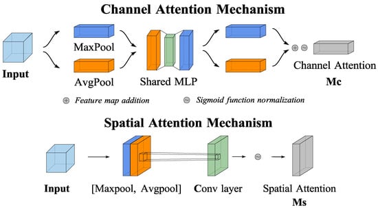 The soft attention mechanism can be divided into channel attention mechanism and spatial attention mechanism. The structures of the channel attention mechanism and spatial attention mechanism are shown in Figure 5. The channel attention mechanism focuses on the features of the image channels and alters the model’s attention distribution by amplifying or reducing certain channel features. This involves global average and max pooling of the input feature map, followed by a shared fully connected layer. The output is then processed with a sigmoid activation function to obtain channel weights (Mc) between 0 and 1. The spatial attention mechanism focuses on the spatial structure of an image by amplifying or reducing certain regions, which alters the model’s attention. To do this, the input feature map undergoes global average and max pooling, followed by a convolutional layer. The resulting output is passed through a Sigmoid function, resulting in a spatial weight map (Ms) with values between 0 and 1.
