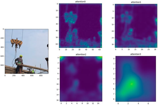 In this paper, the implementation of the attention mechanism is spatial attention, which calculates weights for each position in an image and then uses these weights to compute a weighted average overall feature. As shown in Figure 6, the attention mechanism visualizes where attention is focused during the recognition process, highlighting the worker and the hook to enhance perception and understanding of the image.