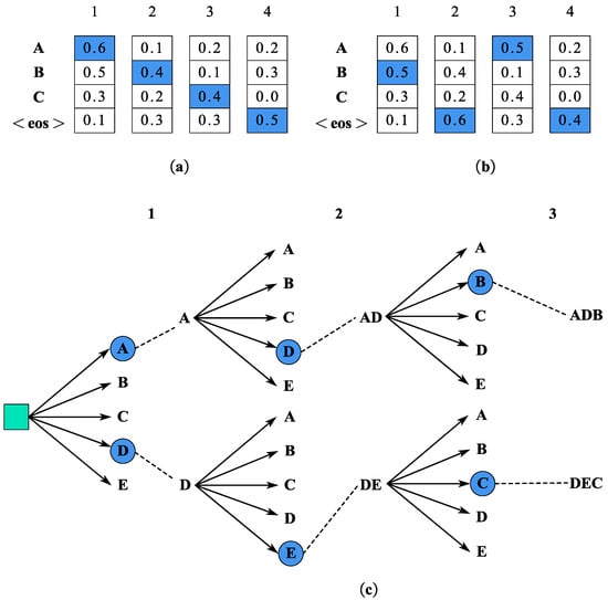 where L is the length of the final candidate sequence and is set to 0.75. In beam search, the smaller the beam width, the fewer exhaustive searches and the faster the prediction, but the lower the accuracy. Conversely, the larger the beam width, the more exhaustive searches and the slower the prediction, but the higher the accuracy. When k = 1, it is equivalent to greedy search, and when k = n, it is equivalent to exhaustive search. Beam search can find a balance between accuracy and computational cost by flexibly choosing the beam width k. Figure 7c shows a simplified process of beam search when k = 2 and the output sequence length is 3.
