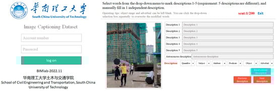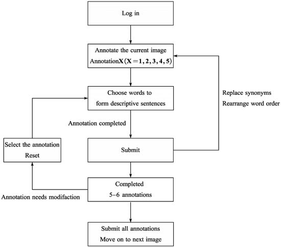 Before launching the crowdsourcing initiative, a webpage and vocabulary library were created for online image annotation. As shown in Figure 8, annotators can log in using individual account passwords and click buttons to provide annotations for each image. They can replace or delete incorrect annotations by clicking “reset”. The image annotation process is shown in Figure 9. As shown in Figure 10, annotators are required to annotate according to the basic linguistic paradigm of quantifier + subject–predicate–object + attribute + adverb.