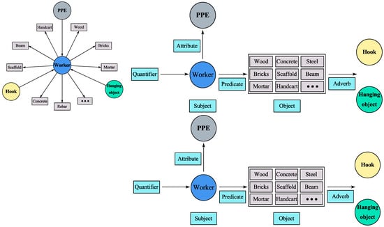 In recent years, computer vision techniques combined with deep learning algorithms have been widely used to capture visual-semantic information from visual data [], with four main categories of approaches: object recognition [,], motion recognition [,], activity recognition [], and scene analysis [,]. While current research in computer vision primarily focuses on single element identification (e.g., objects, relationships, and attributes) from images, there is less attention given to finer-grained semantic information such as the relationships between different objects and contextual information of scenes. However, the construction site environment is highly complex, with limited space and high personnel density, and involves multiple types of construction machinery and tools [,]. Furthermore, complex interactions exist between workers, machinery, and tools []. There is a need for an automated capture method that treats the construction activity scene as an integral whole by capturing the multiple objects, relationships, and related attributes from visual data and converting them into complete sentences [].