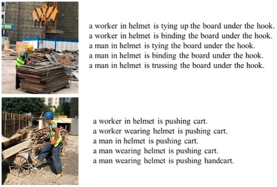 In addition to the aforementioned publicly available datasets, some researchers have developed specialized datasets specifically for construction scenes. For example, Liu et al. [] created two unique image captioning datasets, which include 7382 images covering five categories of general construction scenes: masonry work, wheelbarrow work, rebar work, plastering work, and tiling work. Bang et al. [] constructed a dedicated image caption dataset consisting of 1431 images and 8601 captions describing the image regions captured by the UAVs at six different construction sites. Wang et al. [] annotated over 6000 images selected from ACID with natural language captions, collecting 2–3 captions for each image, to create the ACID-C dataset, which was used for information mining and scene caption in large construction machinery construction scenes based on object detection and semantic information extraction models.