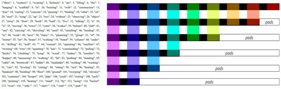 Before training, text needs to be preprocessed. First, remove the tag symbols, convert all uppercase letters to lowercase, calculate the frequency of each word, and generate the wordmap as shown in Figure 12. The wordmap also includes the words “start”, “end”, and “pad” that are not present in the captions. This is because before predicting and generating the first word, the zeroth word <start> is needed to initiate the prediction process. At the same time, the decoder also needs the end word <end> to mark the end of decoding. In addition, to pass the caption sentences as fixed-size tensors, <pad> is needed to expand captions of different lengths into the same length. Each word is assigned a unique index in the wordmap, and vectors for each word can be generated based on the index. Figure 12 shows the process of padding sentence vectors of different lengths. Each word is given an independent index in s, and the vector of each word can be generated by the index.