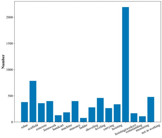 Based on this research, a portion of the construction image data is selected from the SODA dataset []. Additionally, some videos are crawled from the internet, and frame extraction is used to obtain some image data. In total, nearly 20,000 on-site construction images are obtained and screened. The screened images must meet at least the following requirements: (1) contain one or more construction activities; (2) have sufficient clarity; (3) have clear image semantics. Through screening and processing, 14,000 construction image data are obtained.