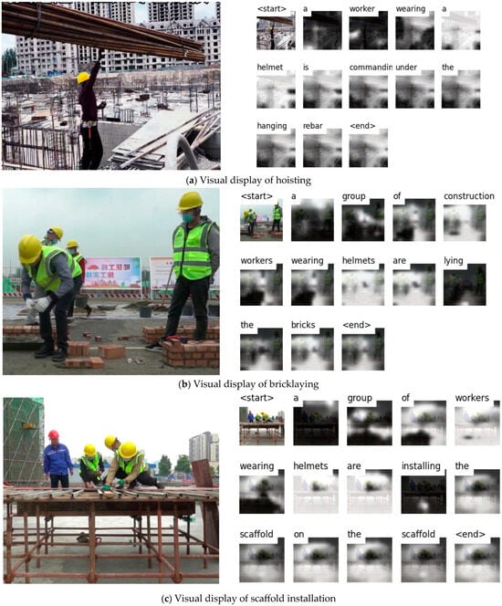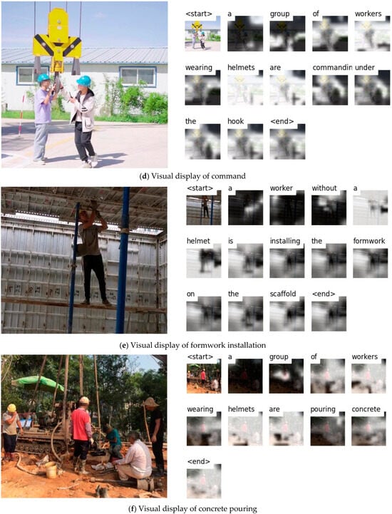 Furthermore, to enhance the model’s generalization capability, the diversity of the dataset needs to be improved. Specifically, it is essential to incorporate images captured under varying conditions, such as different lighting, occlusions, and camera angles. This would help mitigate issues observed in Figure 16e, where the model failed to recognize the absence of a safety helmet due to lighting and camera angle variations. Additionally, the precision of data annotation warrants further attention. The current dataset lacks detailed annotations for individual safety helmets, preventing the model from accurately classifying workers wearing or not wearing helmets, as seen in Figure 16f. Given the critical role of safety helmet recognition in construction site safety, refining data annotation should be a priority in future work. A potential approach could involve integrating object detection with image captioning techniques to improve the model’s ability to identify individual objects within an image.