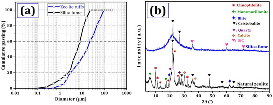 The analysis of the particle size distribution and XRD diffractogram in Figure 1 provides valuable insights into the composition and characteristics of silica fume and natural zeolite powders. The median particle diameter of silica fume natural zeolite is determined to be 17.30 μm and 6.50 μm, respectively. Examining the XRD patterns of natural zeolite (Figure 1b), it is evident that clinoptilolite-zeolite (PDF No. 00-003-0010) constitutes the primary mineral in the natural zeolite tuff, comprising approximately 27.75% of the sample. Other significant constituents include cristobalite (PDF No. 01-077-1317) at around 27.15%, illite (PDF No. 00-009-0334) at 18.03%, and montmorillonite (PDF No. 01-089-7539) at 17.45%. Quartz (PDF No. 01-086-1629) and calcite (PDF No. 00-051-1524) are present in minor quantities, as outlined in Table 1. Contrastingly, the XRD analysis of silica fume indicates low percentages of crystalline mineral phases such as cristobalite and SiC. The material is predominantly composed of amorphous silica, accounting for 91% of its composition.