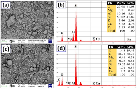 (a) SEM of natural zeolite, (b) EDS of natural zeolite, (c) SEM of silica fume, and (d) EDS of silica fume.