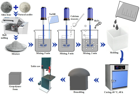The chemical foaming preparation process of geopolymer foams, as outlined in Figure 3, involves several sequential steps. Initially, a homogenous mixture is achieved by milling 50 wt% of natural zeolite with 50 wt% silica fume in a planetary ball mill for 15 min at 200 rpm. Subsequently, the produced mixture is treated with 15 M NaOH solution, prepared by dissolving a stoichiometric amount of NaOH granules in distilled water (Table 3). The NaOH content in the mixture is 25.2 g, ensuring the necessary alkalinity for effective geopolymerization. Regarding the water-to-solid (W/S) ratio, a value of 0.42 was chosen to balance workability, reaction kinetics, and final porosity. This ratio facilitates adequate mixing and moldability while promoting the optimal dissolution of raw materials, enhancing polymerization reactions, and achieving the desired pore structure in the final geopolymer foam. The resulting mixture is thoroughly mixed using a laboratory overhead mixer operating at 1000 rpm for 5 min, facilitating dissolution and polycondensation reactions that generate a viscous slurry, accompanied by heat evolution due to the exothermic nature of the reaction. Firstly, sodium hydroxide dissolves the silica fume, releasing reactive silicate species like sodium silicate, which becomes available for subsequent chemical reactions [54]. The resulting soluble sodium silicate acts as an effective binder, playing a basic role in the development and strengthening of geopolymeric systems. Following this, varying proportions (0.15 and 0.30 wt%) of calcium stearate foam stabilizer are introduced into the slurry and mixed for an additional 5 min at 1000 rpm. Successively, H2O2 foaming agent (0.25, 0.50, 0.75, 1.00, and 1.25 wt%) is added to generate O2 gas bubbles within the mixture, which is thoroughly mixed for an additional 2 min. The resulting evenly distributed viscous slurry is then molded in a silicon rubber mold with dimensions of 20 mm × 20 mm × 15 mm. The foam-forming mixture is subsequently cured at 60 °C for 48 h; during which, chemical reactions form the geopolymer structure while gas bubbles expand, yielding a porous material. Following curing, the sample is demolded, shaped using a table saw, and further cured as necessary for specific applications. The chosen composition resulted from preliminary trials optimizing the reactivity, workability, and stability of the geopolymer slurry.