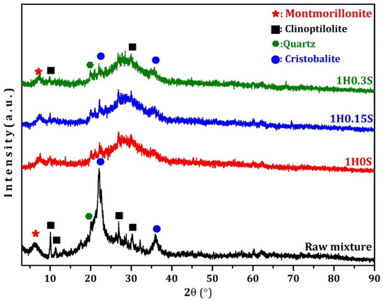 XRD analysis serves as a crucial tool for investigating the complex mineral compositions and phase transitions within geopolymer foams. Typically, the positioning of characteristic peaks within XRD spectra depends on the crystal structure, while the intensity correlates with the mineral concentration. Notably, the XRD spectra show that, when alkali activation occurs, the wide amorphous hump that spans 15–30° in the case of raw materials (as seen in Figure 4) changes to a discrete hump that is positioned towards somewhat higher angles (20–35°). This phenomenon is attributed to the occurrence of polycondensation reactions and the subsequent formation of N-A-S-H gel in geopolymerization [55,56]. This chemical process consumes free water, resulting in an increase in alkalinity, thus facilitating the dissolution of aluminum (Al) and silicon (Si) from natural zeolite and silica fume. Consequently, this dissolution aids in gel formation and effectively stabilizes the structural integrity of foam pores. Despite the incorporation of foaming agents such as hydrogen peroxide (H2O2) and a foam stabilizer like calcium stearate, minimal impact on the phase composition is observed, suggesting stable mineralogical phases. The result also confirms the presence of small peaks of montmorillonite (PDF No. 00-003-0010), clinoptilolite (PDF No. 01-089-7539), quartz (PDF No. 01-086-1629), and cristobalite (PDF No. 01-077-1317). These peaks potentially signify the presence of unreacted compounds from the geopolymer raw materials.