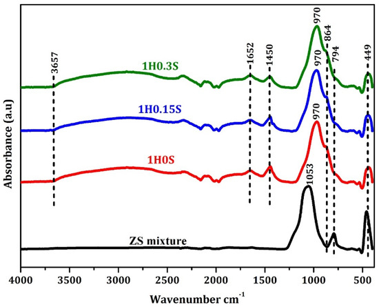 To examine the structural alterations prompted by alkali activation, the samples underwent evaluation via FTIR analysis. Figure 5 compares the FTIR spectra of the raw mixture to the FTIR spectra of the alkali-activated samples containing varying concentrations of foaming agent and stabilizer. The peak at 449 cm−1 was identified as the in-plane bending vibration peak of the Si-O bond [57]. An interesting observation is the disappearance of the 794 cm−1 peak, which exists in the FTIR investigation of the raw materials, attributed to the Si-O bond in the SiO4 tetrahedron [58]. This disappearance post-geopolymerization was attributed to the dissolution of the raw mixture. Additionally, the appearance of Si-O bonds was confirmed by the presence of a peak at 864 cm−1, indicative of asymmetric vibrations of Si-O bonds [59], while the band at 1450 cm−1 was attributed to the asymmetric stretching of the O-C-O bond within CO32− groups, resulting from the interaction between atmospheric carbon dioxide and the alkali solution present during geopolymer formation [60]. The prominent band in the 860–1200 cm−1 range was linked to the asymmetric stretching vibrations of Si–O–T tetrahedra (T = Al and Si). During geopolymerization, the matrix structure experienced a substitution of tetrahedral [AlO4] for the original [SiO4] tetrahedra in the raw powders. This substitution altered the environment surrounding the [SiO4] tetrahedra, causing absorption peaks to move to lower frequencies as a result of increased Si–Al substitution. Consequently, the approximately 970 cm−1 wavelength was identified as the asymmetric stretching band of Si–O–T vibration, serving as a distinctive marker for geopolymer formation [61,62]. Further bands observed include those at 3657 cm−1, corresponding to OH stretching within the three-dimensional porous structure of the geopolymer, and at 1652 cm−1, indicating OH bending of bound water [63].