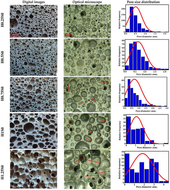 The optical images, SEM images, and pore size distribution of the geopolymer foams are illustrated in Figure 6. The examination of the geopolymer foams revealed a distinctive spherical pore morphology, characterized by a size range spanning from 0.1 to 4.0 mm. The microstructure of the foam is impacted by the quantity of foaming agent incorporated into the geopolymer paste, responsible for generating gas that forms the cellular structure. Notably, there is a tendency for pore sizes and porosity to escalate with the increase in foaming agent volume. The average pore sizes highly increase with increasing the content of foaming agent with less homogeneous pore size distribution. Throughout the process of foam formation, the foaming agents play a crucial role by introducing gas bubbles into the geopolymer mixture. During the setting or curing process, these gas bubbles become trapped inside the matrix, thereby generating pores within the material. Amplifying the volume of the foaming agent can result in the introduction of more gas bubbles, creating a high degree of bubble coalescence wherein adjacent bubbles merge together, leading to larger, uneven cells and reduced foam stability. Observations in the samples containing 0.7–1.2 wt% H2O2 included the coalescence of spherical pores into more intricate shapes and the occurrence of cracking, as indicated by arrows. A critical porosity value indicates a microstructural change in accordance with the percolation theory. A network of interconnected pores with more complex configurations replaces single-celled and closed pores, which are usually ellipsoidal or roughly spherical in form [68].