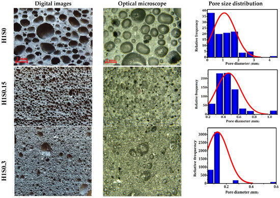 Digital images, optical images, and pore distribution of the geopolymer specimens prepared with a stabilizer.