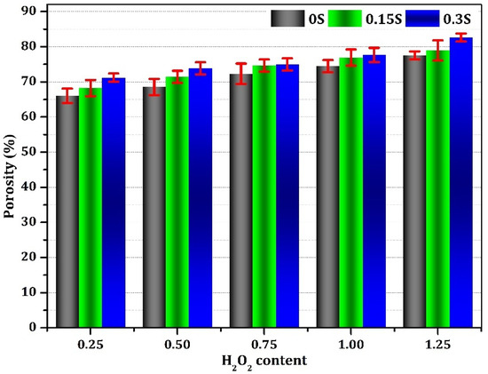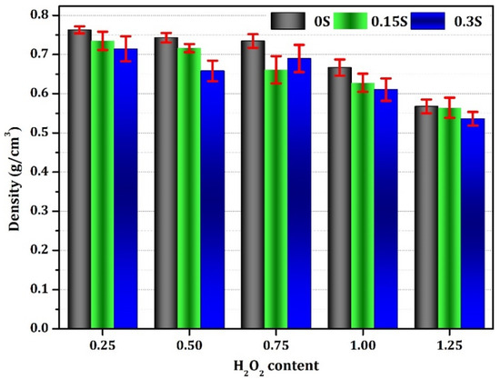 The effect of both the foaming agent and stabilizer on the density of the resulting geopolymer foams is demonstrated in the data presented in Figure 8. It becomes evident that increasing the quantities of these additives correlates with a noticeable decrease in the foam density. With an increase in the content of additives, specifically, as the amount of H2O2 rises from 0.25 to 1.25 wt% and the stabilizer from 0 to 0.3 wt%, the density changes from 0.76 to 0.53 g/cm3. This notable variance can largely be attributed to the concurrent increase in porosity facilitated by the intensified presence of these agents. The foaming agent and stabilizer contribute to the formation of gas bubbles within the geopolymer mixture, thereby generating pores in the material as it sets or cures. With a greater volume of foaming agent and stabilizer, more stabilized gas bubbles are introduced into the mixture, leading to higher porosity and, consequently, lower foam density. This observed relationship indicates the significant role played by these additives in modulating the physical properties of geopolymer foams, with implications for various applications where foam density is a critical parameter.