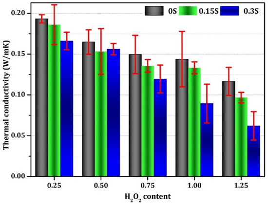 Figure 10 presents the impact of both the H2O2 content and stabilizer concentration on the thermal conductivity of geopolymer foam. This test evaluates the foam’s ability to transfer heat under ambient conditions. A noteworthy observation was made regarding the impact of increasing H2O2 and the stabilizer amount on reducing the thermal conductivity values of the geopolymer specimens, resulting in a range of values from 0.193 to 0.062 W/m·K. The decrease in thermal conductivity values can be assigned to the presence of voids within the geopolymer matrix, which act as insulating barriers against heat transfer. Specifically, geopolymer samples containing 0.25% H2O2 and no calcium stearate demonstrated a maximum thermal conductivity of 0.193, whereas samples with 1.20% H2O2 and 0.30% calcium stearate exhibited a minimum thermal conductivity of 0.060 W/m·K, marking a significant reduction of 68.97%. This reduction in thermal conductivity holds significant implications for energy efficiency in building applications, as it helps minimize heat loss and thus lowers overall energy consumption.