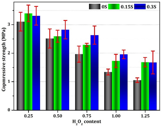 The results of the compressive strength test, displayed in Figure 11, offer important information on the mechanical characteristics of the geopolymer foams. Within this dataset, the compressive strength values ranged from 1.05 to 3.30 MPa, indicating significant variability in the foam’s structural integrity. Notably, an inverse relationship was observed between the H2O2 content and compressive strength, with increasing H2O2 levels leading to a substantial decrease in compressive strength [70,71]. This decrease was found to be about a 68% reduction when the H2O2 content increased from 0.25 to 1.25. However, it is worth noting that, while an increase in stabilizer content resulted in heightened porosity within the foam, it assisted in raising the compressive strength. This seemingly contradictory effect can be ascribed to the creation of smaller and more uniformly distributed pore structures within the foam matrix, since evenly distributed pores help to prevent isolated areas of weakness by more uniformly distributing stress throughout the material and reducing the likelihood of structural failure. As a result, foams with smaller and evenly distributed pores tend to exhibit a higher compressive strength compared to foams with larger or irregularly distributed pores [72,73].
